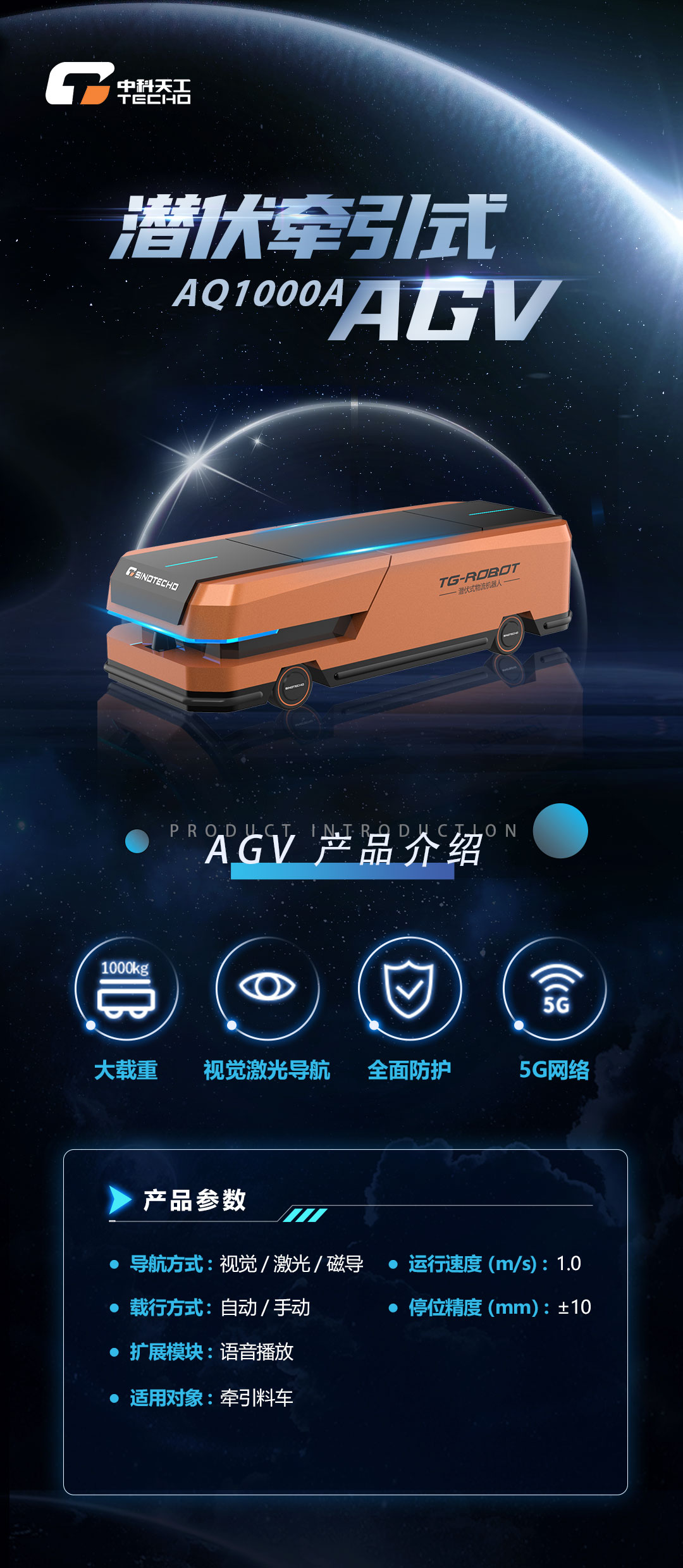 中科天工潜伏牵引式AGV AQ1000A采用激光+视觉+磁导多种导航的方式,具有大载重、视觉激光导航、5G网络、全面防护的特点,能充分适应各种苛刻场地对自动物流的要求。