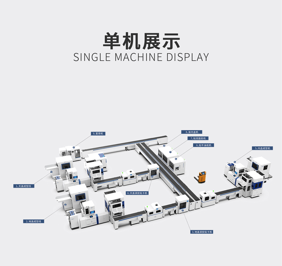 该整线完整的解决了盒坯成型、异型天地盖成型、自动贴衬、天地盖组装、自动施胶组装子件、自动套袋等全套工艺;采用模块化设计、分段式控制、数字化调节,操作简单,人力极大精实。是我司针对天地盖