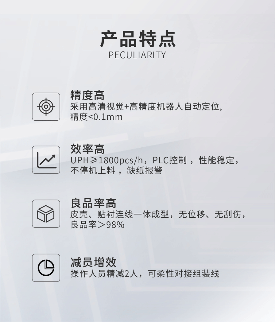 智能皮壳一体机是我司针对高端精品烟、酒盒包装领域开发的制盒专用产线。该产线可实现送面纸不间断上料、面纸过胶,灰板上料,面纸与灰板自动视觉定位粘合、皮壳四面包成型、皮壳在线翻转、衬纸上料、衬纸过胶、皮壳衬纸在线粘合成型、在线压平压槽、收料等工艺连线操作,生产流程全自动化。线体布局合理,占地面积小,皮壳机与裱衬机通过翻转机相连,操作人员精减2人,生产效率大幅提升。我司针对此线,已申请多项专利,拥有完整的专利保护链。