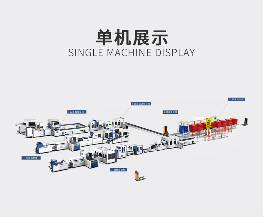 该整线采用视觉定位+双工位成型设计,同时采用专利技术实现底部无痕工艺,提升产品品质,实现了 精品酒盒从酒桶盒身成型、盒盖成型、围框成型、桶身桶盖组装及子配件组装、自动拆托盘码垛、封膜等 一系列工艺自动完成,无缝对接智能物流上下料。我司针对此线,已申请多项专利,拥有完整的专利保护链。